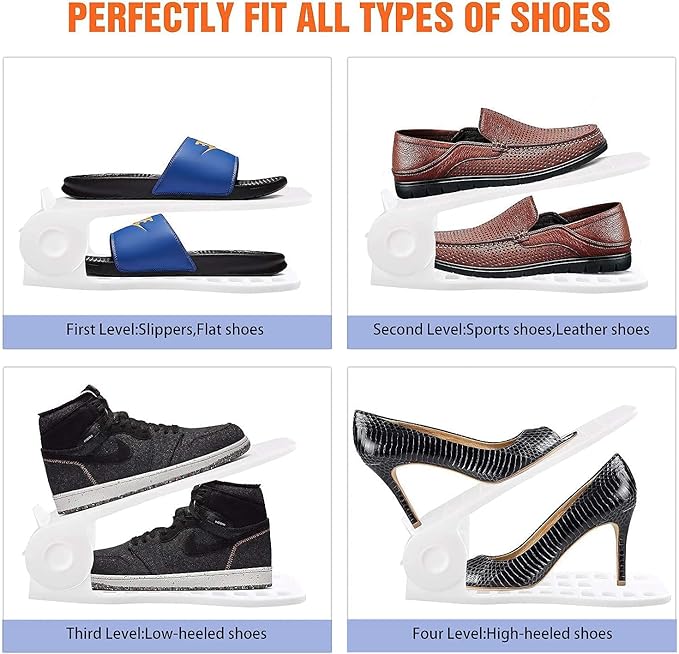 - 【SUPER ANTI-SLIPPING DESIGN】Our shoe stacker is specifically designed with top flaps at both sides and behind, along with little bumps on the surface to prevent the upper shoe from slipping off, keeping your space tidy and neat. Similar to shoe slotz.