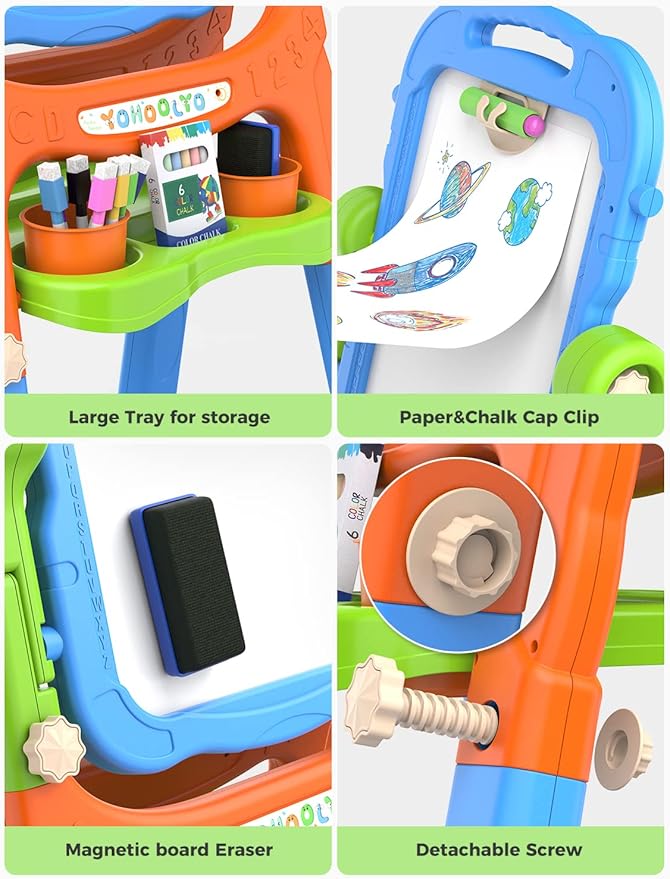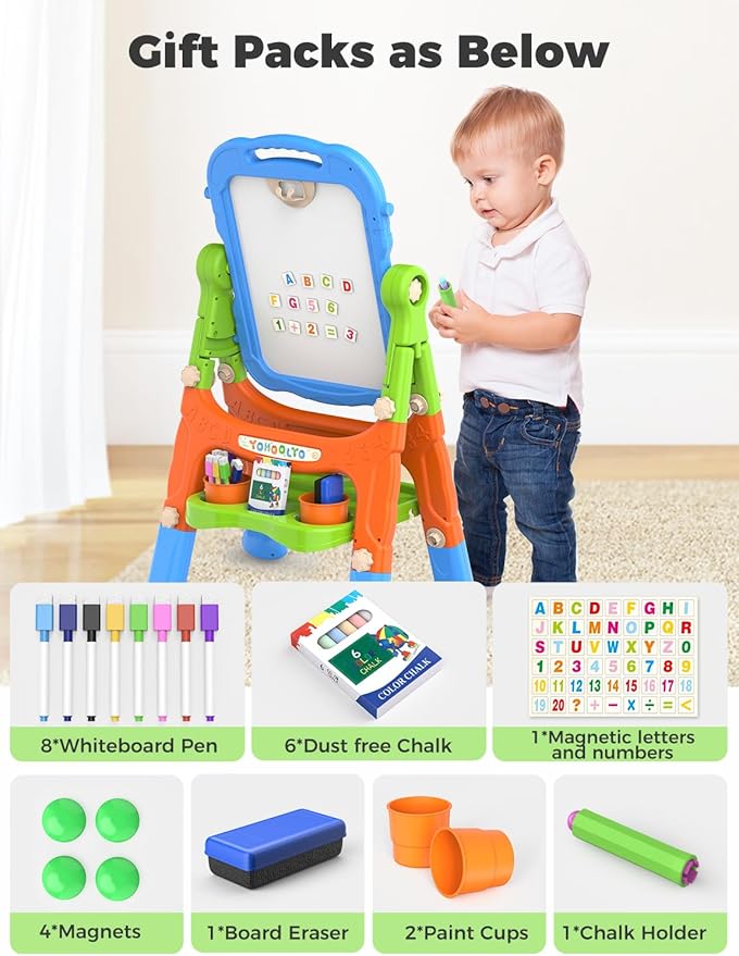 - Sturdy and Sustainable Art Easel: Double-Sided kids easel is a sturdy and sustainable dry-erase board/chalkboard for kids ages 3 years up