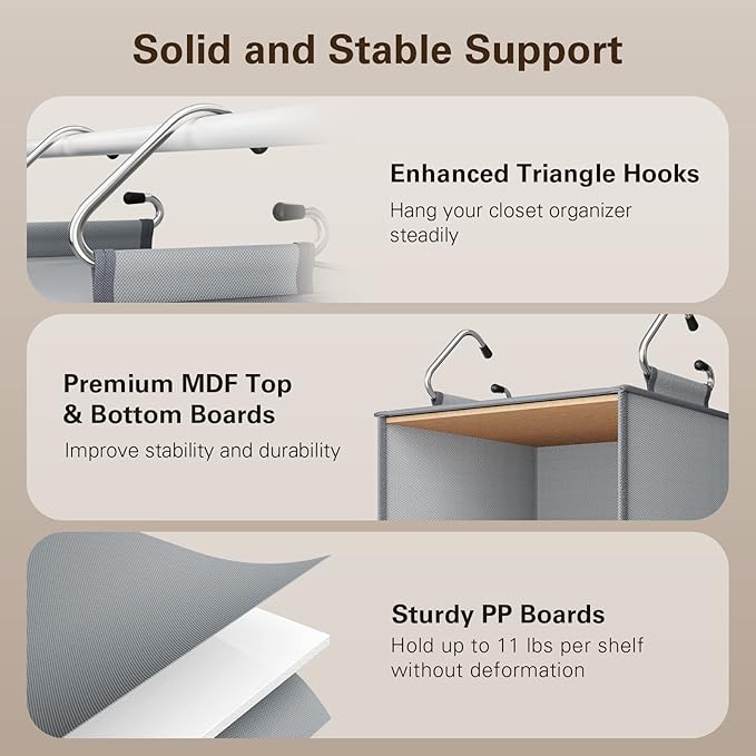 - Extra Strong & Stable: Featuring high-quality non-woven fabric with sturdy polypropylene support boards in the middle, this closet hanging organizer holds up to 40 lbs without deformation. Each shelf can hold up to 11 lbs. Premium MDF boards in the top and bottom and enhanced triangle hooks ensure stability for your storage space.