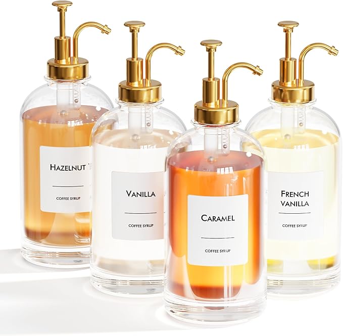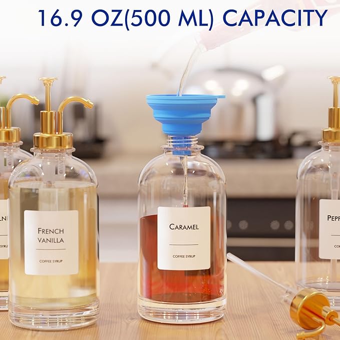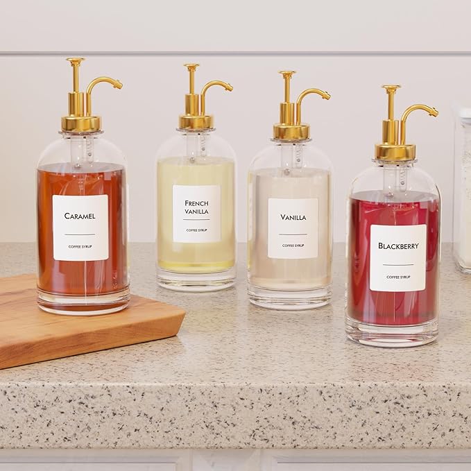 - Complete Coffee Syrup Dispenser Set: This set includes 4 high-quality glass bottles (16.9 oz/500 ml) with pumps, a funnel, and 28 syrup labels to keep your coffee bar organized and stylish.