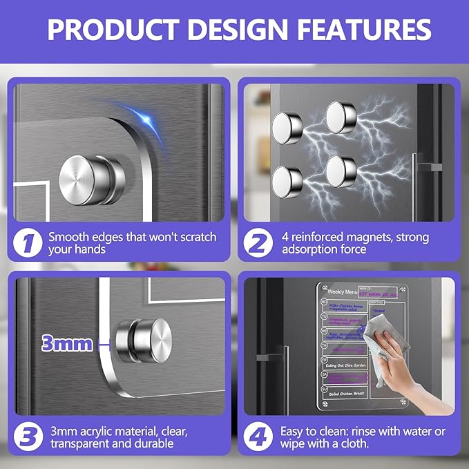 - Premium Quality with Strong Magnetism - Made with high-quality acrylic and equipped with powerful N50 magnets, this fridge dry erase board is designed to last and stay firmly in place. The sleek, clear acrylic adds a modern touch to your kitchen décor while ensuring the board is always ready for use.