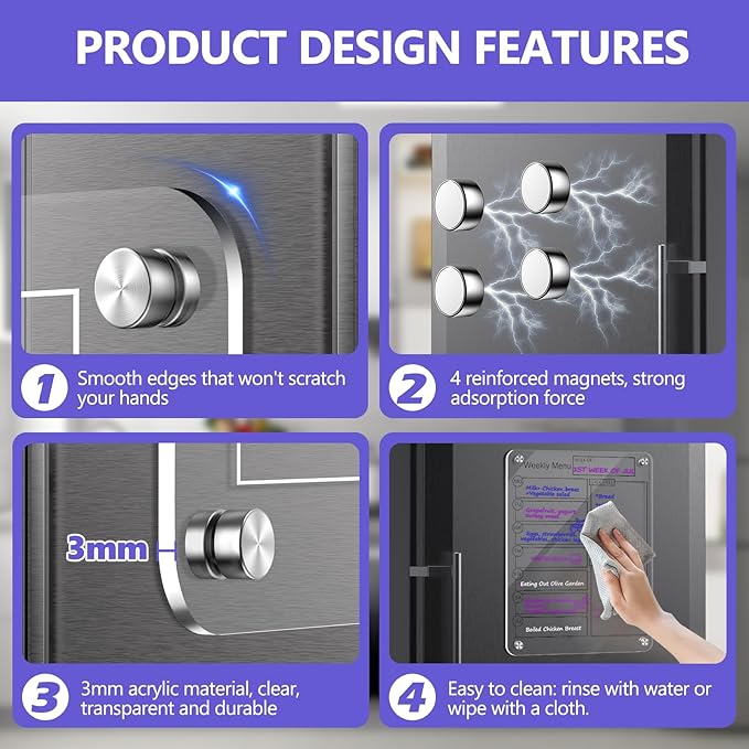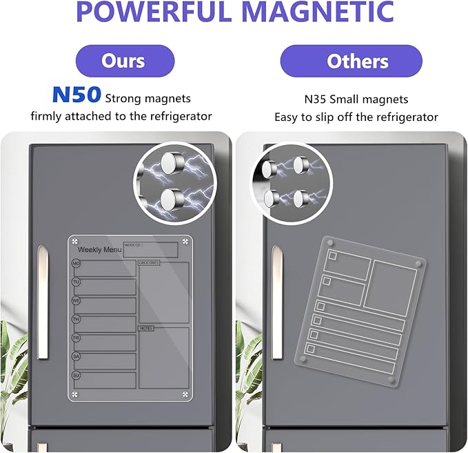 - Premium Quality with Strong Magnetism - Made with high-quality acrylic and equipped with powerful N50 magnets, this fridge dry erase board is designed to last and stay firmly in place. The sleek, clear acrylic adds a modern touch to your kitchen décor while ensuring the board is always ready for use.