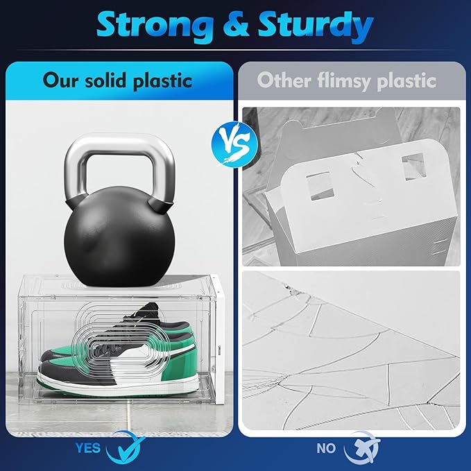 - 【Clear Shoe Box Stackable】Clear magnetic front door, stackable design, harder material, the shoe storage organizer provide you a more load-bearing multiple layers of shoe walls.You can find out the shoes with a glance over the boxes without open the boxes