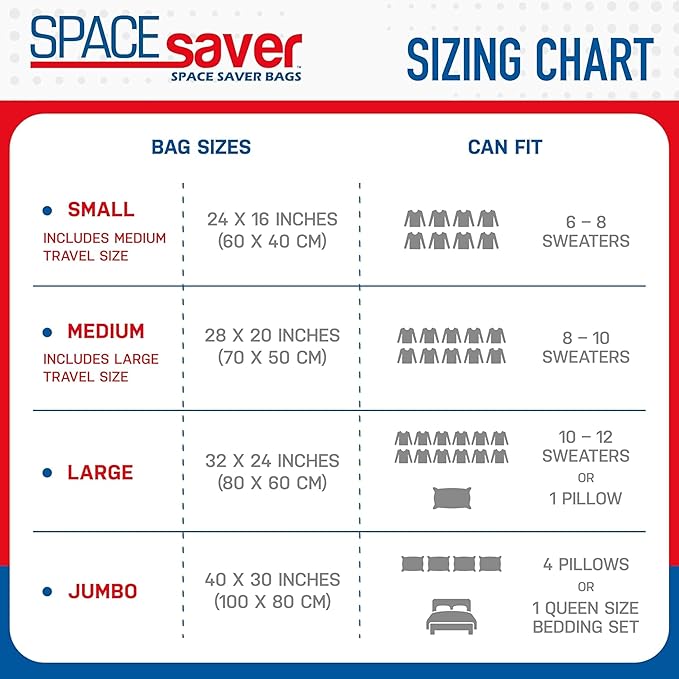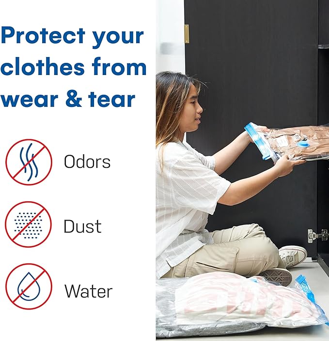 - Complete Set with Pump: Includes 12 variety vacuum sealed bags and a portable hand pump. Use these space-saving packing bags for moving, travel, dorm storage, or home improvement projects.