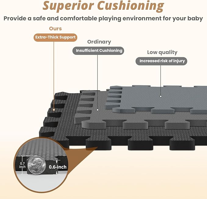 - Thick Foam Mat: These 0.6-inch extra-thick foam floor tiles for kids provide a safe area for kids to play, preventing them from bumping into things while playing.