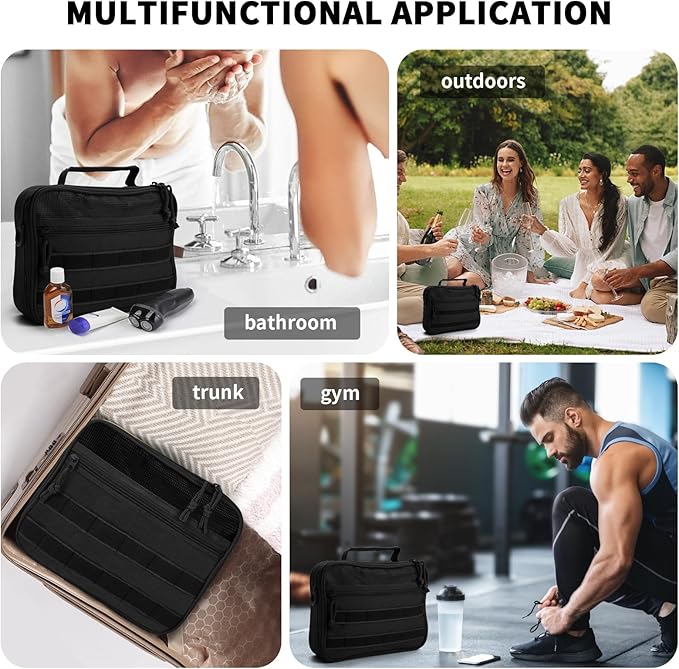 - Convenient Hanging: Our hanging Toiletry Bag Equipped with a comfortable handle and a convenient hook that allows you to easily suspend it from towel racks, coat hooks,bathroom door, or any other convenient spot,convenient for access and saving space. It also has an adjustable string for hanging from door handles or branches. The top handle makes it easy to carry, and the Molle design of the front pocket allows for additional attachments.