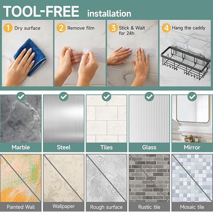 - Waterproof & Rust-Resistant: Designed for use in high-moisture areas, this caddy is made from rustproof and waterproof materials. It resists corrosion over time, keeping your shower organization solution looking pristine in damp environments.