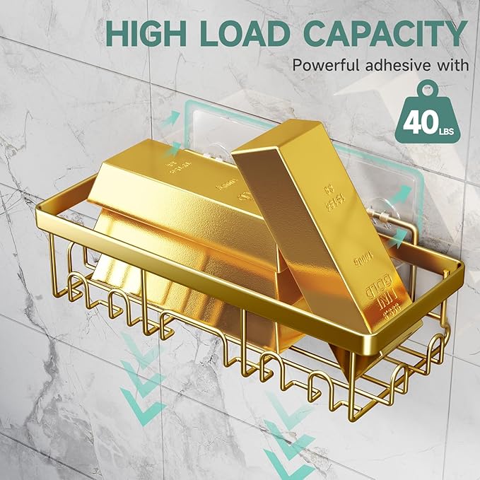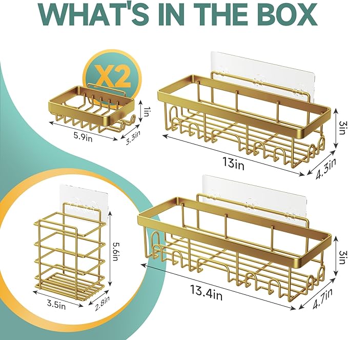 Veken Adhesive Shower Caddy 5-Pack,Heavy Weight Bearing,Large Wall Mounted Shower Shelves Rack,Organizer Storage Accessories with Soap Dish&Toothbrush Holder,Ideal for Bathroom,Home&Kitchen,Gold