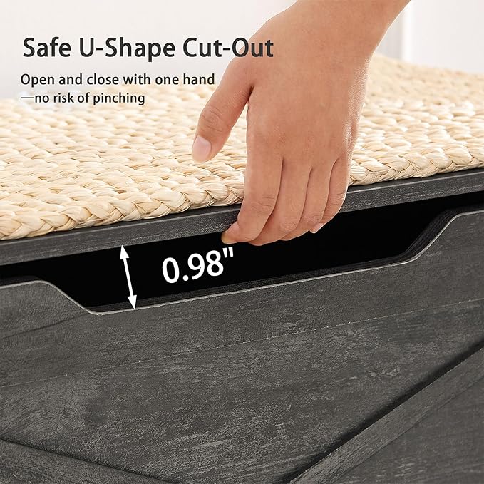 VECELO 43.3" Storage Chest with Lift Top Storage, Farmhouse Style Ottoman with Handwoven Wicker Cushion, Safety Hinges, Ideal for Entryway, Bedroom, Living Room, Coal Grey