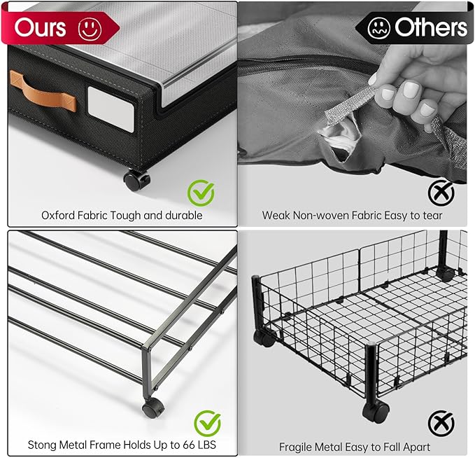 - Hold Up to 66lbs: Yecaye under bed storage with wheels is made of high quality 600D oxford fabric and sturdy metal frame, can hold up to 66 lbs, stronger than other fragile metal mesh, spacious capacity perfect for storing clothes, toys, books, shoes and other heavy items also won't compromise stability and durability