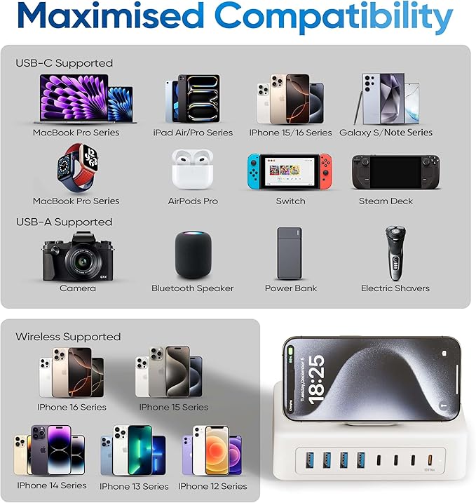 - 【115W Total Fast Charging Station】C1/C2: PD65W Max per port, C3/C4: PD20W Max per port, 4 USB-A ports shared 5V/3A. The 65W USB-C port provides fast charging for high-demand devices such as a MacBook Pro, effectively charging up to 50% in just 35 minutes. When charging your laptop, please select USB-C1/C2 output port.