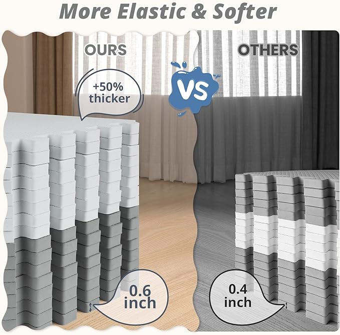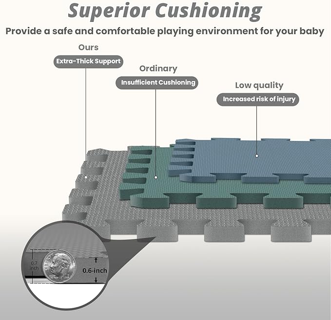 - Thick Foam Mat: These 0.6-inch extra-thick foam floor tiles for kids provide a safe area for kids to play, preventing them from bumping into things while playing.