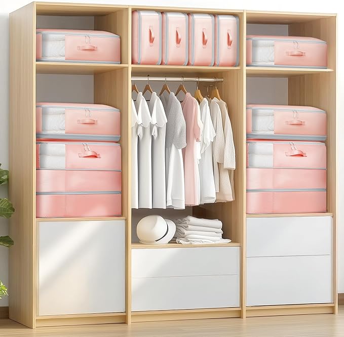 - [Large-Capacity Versatile Storage]: These compression clothing storage bags are ideal for storing comforters, blankets, winter coats, down jackets, sweaters, pillows, bed sheets, towels, scarves, and even seasonal clothing, adapting to all your storage needs. From bulky duvets to lightweight quilts, they accommodate a wide range of items. The ultra space saving self compression design maximizes closet or under-bed space, keeping everything compact, organized, and protected