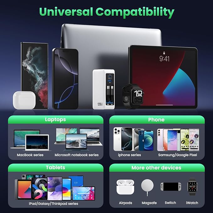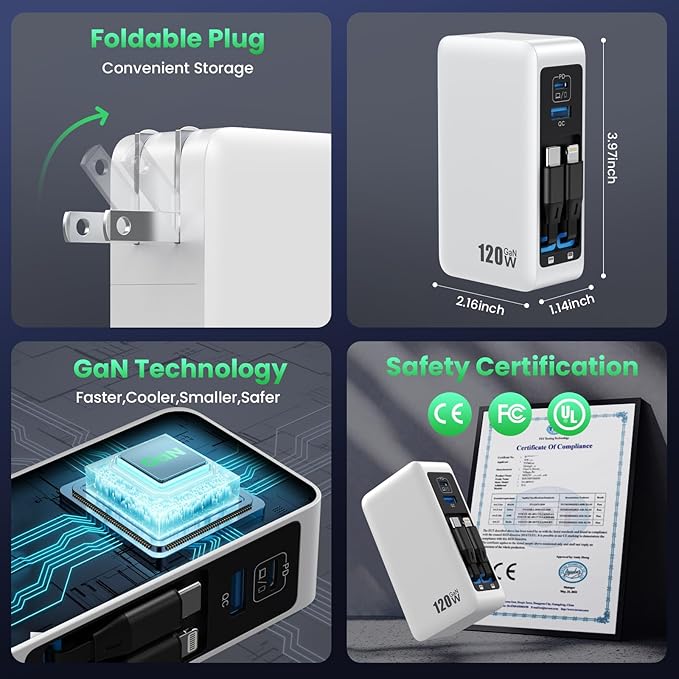 - Special Feature : 120W USB C Charger Block with 2 Built-in Retractable Cables,4-in-1 GaN IV Foldable Plug Wall Charger Fast Charging Station,PD 65W Laptop Adapter for Macbook/iPad,iPhone 16/15/14,Galaxy S24,Android etc 120W USB C Charger Block with 2 Built-in Retractable Cables,4-in-1 GaN IV Foldable Plug Wall Charger Fast Charging Station,PD 65W Laptop Adapter for Macbook/iPad,iPhone 16/15/14,Galaxy S24,A… See more