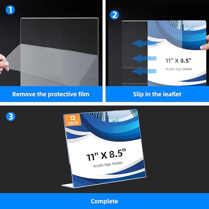 - 12 Pack Durable 11x8.5 Plastic Sign Holders: Designed with a slanted back and L shape base, these sign holders securely display flyers, menus, and documents in high-traffic areas. The anti-slip silicone pads ensure stability on countertops or desks, preventing slips even during busy hours. Perfect for restaurants, retail stores, offices, and events.