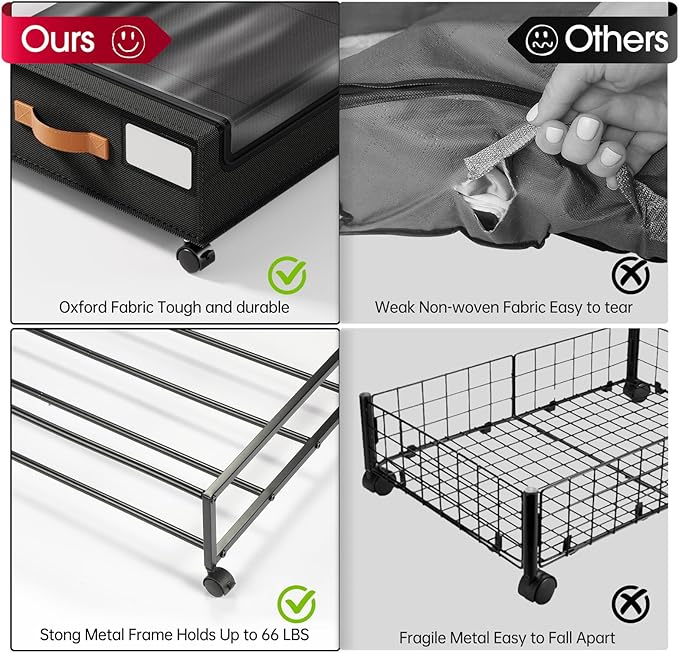 - Stronger & Larger Capacity: Yecaye under bed storage with wheels is made of high quality 600D oxford fabric and sturdy metal frame, can hold up to 66 lbs, stronger than other fragile metal mesh, with upgraded larger sizes of 70L (35.5 x 17 x 6.7 inches) spacious capacity perfect for storing clothes, toys, books, shoes and other heavy items also won't compromise stability and durability