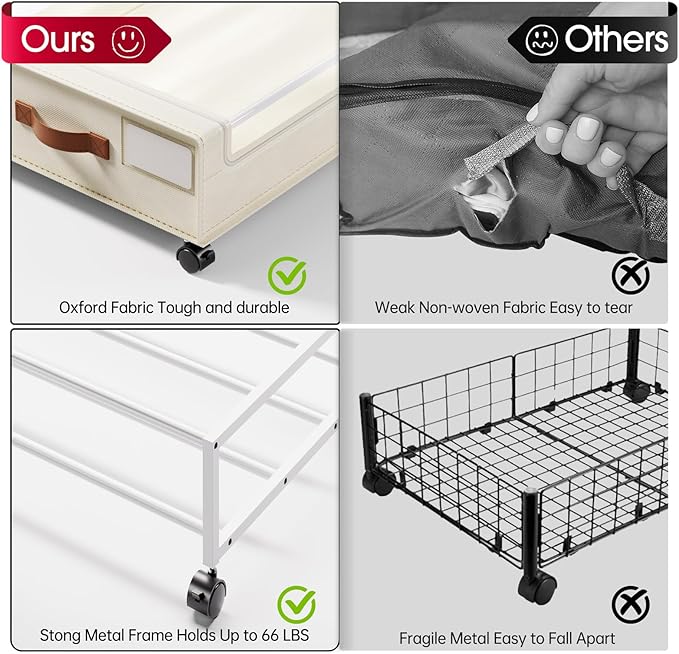 - Stronger & Larger Capacity: Yecaye under bed storage with wheels is made of high quality 600D oxford fabric and sturdy metal frame, can hold up to 66 lbs, stronger than other fragile metal mesh, with upgraded larger sizes of 70L (35.5 x 17 x 6.7 inches) spacious capacity perfect for storing clothes, toys, books, shoes and other heavy items also won't compromise stability and durability