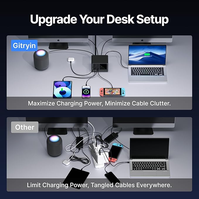 - Compact Design, Seamless Use: The ultra-compact design saves 50% desk space compared to traditional setups, ideal for crowded desks, home offices, or travel. Enjoy a simplified charging experience without the hassle of constantly plugging and unplugging devices. Bonus: The 45° angled plug effortlessly fits behind furniture or tight wall sockets.