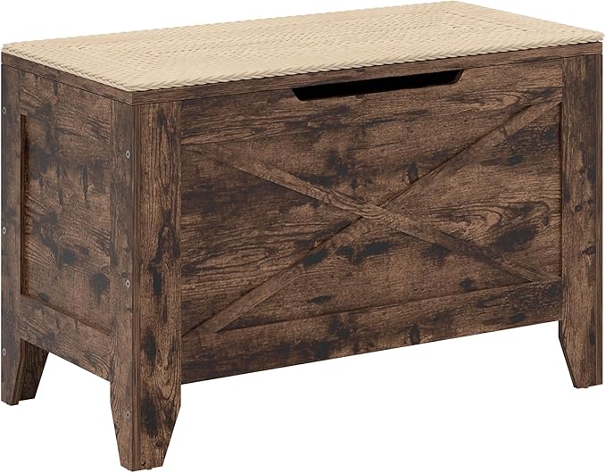 VECELO 30" Storage Chest with Lift Top Storage, Farmhouse Style Ottoman with Handwoven Wicker Cushion, Safety Hinges, Ideal for Entryway, Bedroom, Living Room, Walnut Brown