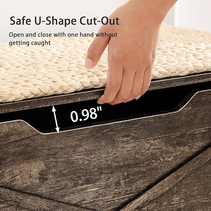 - : Material Farmhouse Style Ottoman with Handwoven Wicker Cushion, Safety Hinges, Ideal for Entryway, Bedroom, Living Room, Walnut Brown Farmhouse Style Ottoman with Handwoven Wicker Cushion, Safety Hinges, Ideal for Entryway, Bedroo… See more