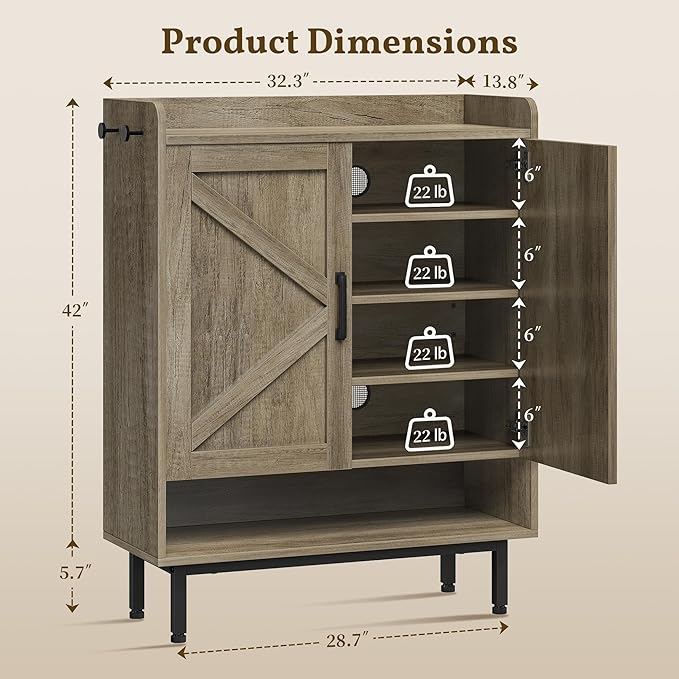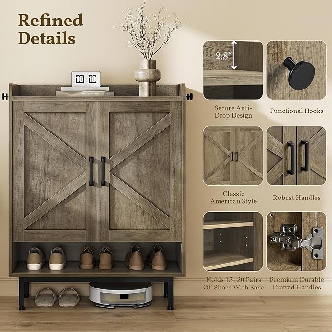 Yaheetech Shoe Storage Cabinet with Barn-Inspired Doors, 6-Tier Shoe Cabinet with Adjustable Shelves & Side Hooks, Compact Shoe Rack Organizer Cabinet for Entryway, Hallway, Gray
